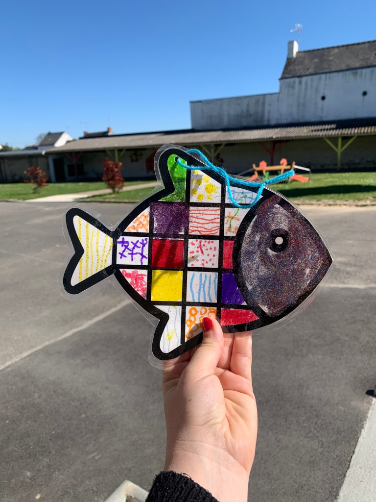 Une fois le graphisme terminé et quelques paillettes collées stratégiquement, nous avons plastifié les poissons pour qu’ils soient rapportés à la maison. Une manière de valoriser le travail de chacun, de l’exposer fièrement à la maison.