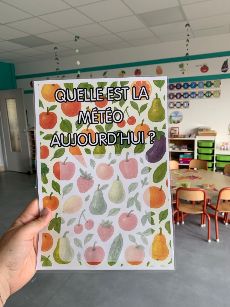 Chaque matin, un élève devient le présentateur météo de la classe : il observe le ciel et indique le temps qu’il fait grâce à notre affichage coloré version fruits & légumes.